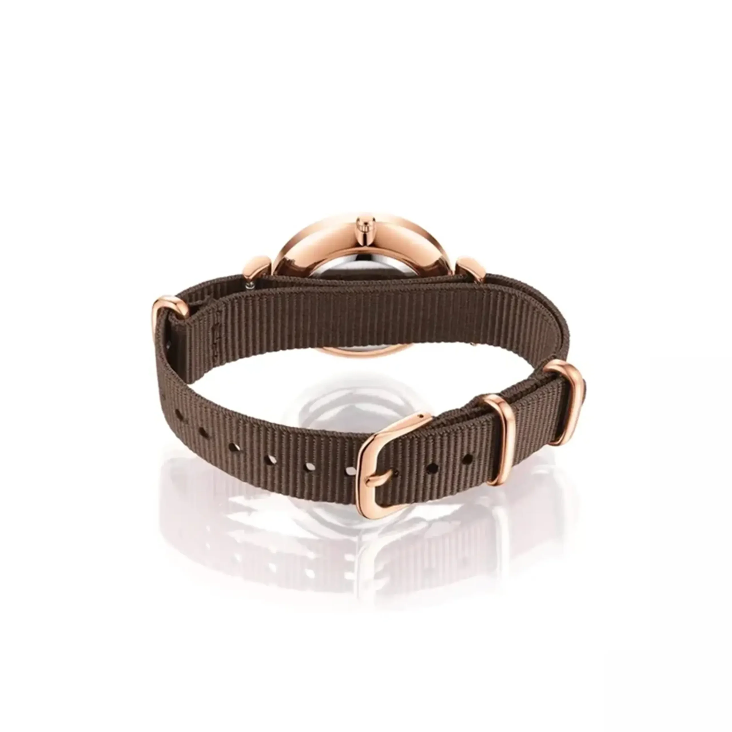 این ساعت با مقاومت در برابر آب تا 3ATM (معادل شست‌وشوی دست و بارش باران سبک) طراحی شده و برای استفاده روزانه گزینه‌ای مطمئن به حساب می‌آید. قطر صفحه 38 میلی‌متر و ضخامت 11 میلی‌متر باعث می‌شود روی دست خوش‌فرم بنشیند. رنگ‌بندی قهوه‌ای، رزگلد و سفید نیز جلوه‌ای شیک و متعادل به آن داده است.