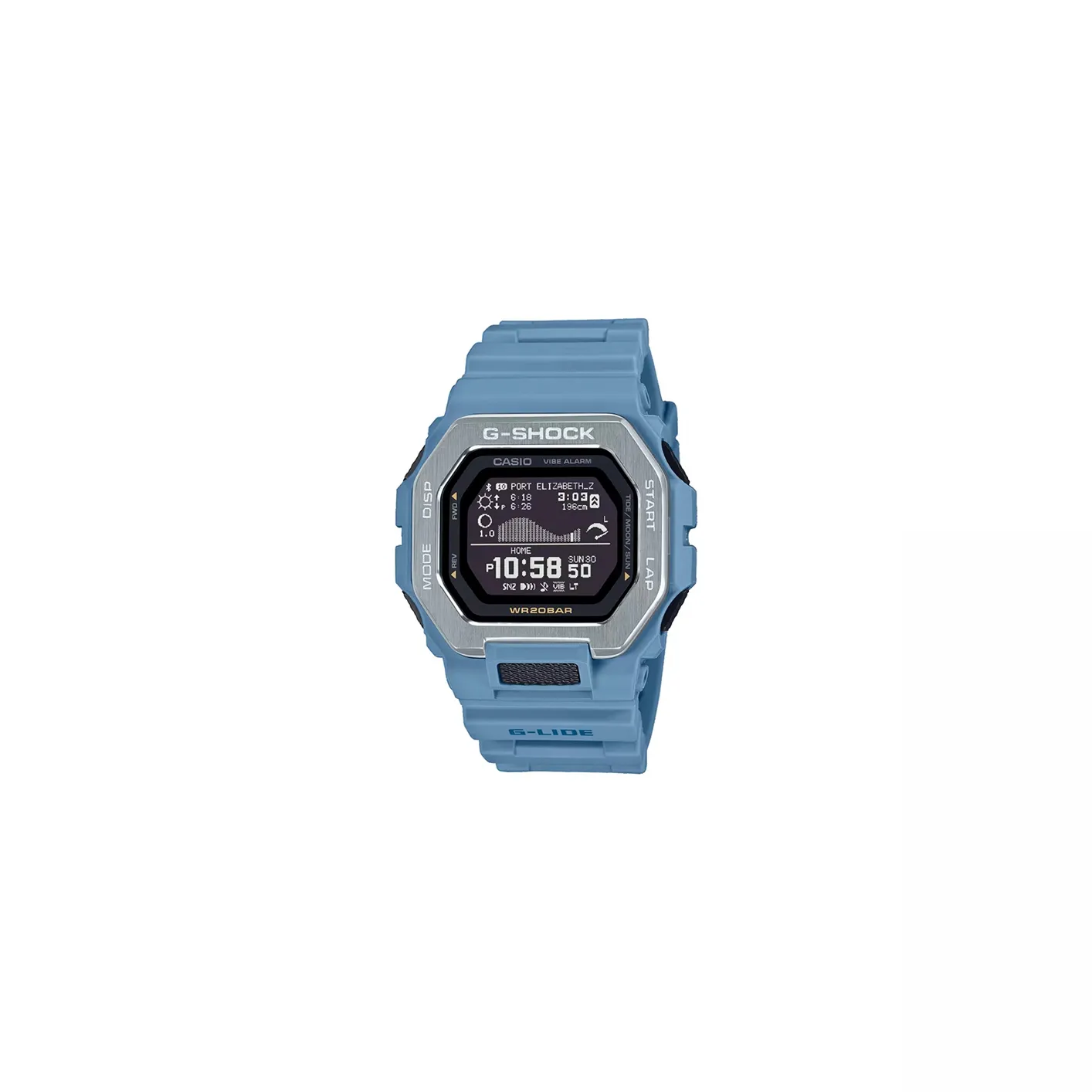 ساعت مچی اسپرت جی شاک کاسیو مدل G-SHOCK GBX-100-2DR اطلاعات جزر و مد و زمان طلوع و غروب خورشید را برای حدود ۳,۳۰۰ مکان در سراسر جهان از طریق اپلیکیشن اختصاصی تنظیم می‌کند. نمایشگر MIP LCD با وضوح بالا دید را بهبود می‌بخشد و همراه با قابلیت‌های اندازه‌گیری تمرین، برای موج‌سواران بسیار کاربردی است.